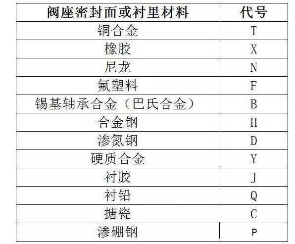 第五單元是閥座密封面或襯里材料代號(hào),用漢語(yǔ)拼音字母表示: