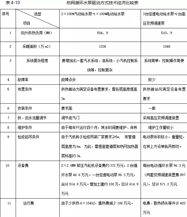 根據電動和汽動熱網循環水泵的結構特點,本研究針對兩個供熱首站的內部情況進行了布置,其技術經濟比較見表4-10:
